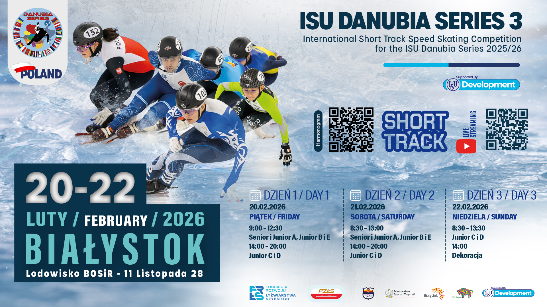 W dniach 20–22 lutego 2026 roku Białystok stanie się centrum międzynarodowego short tracku, goszcząc trzecią edycję zawodów Danubia Series w sezonie 2025/2026. Na lodowisku BOSiR rywalizować będą najlepsi młodzi łyżwiarze z Europy, a także czołowi reprezentanci Polski.