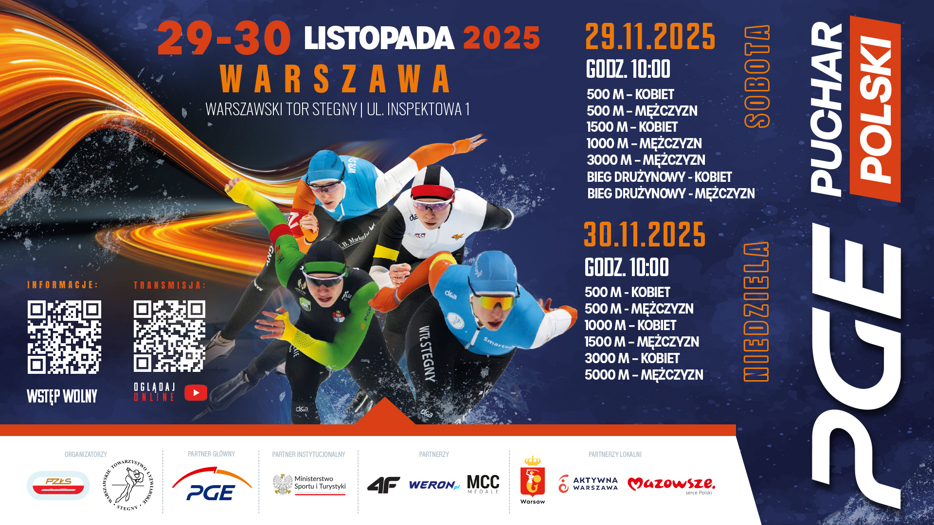 PGE Puchar Polski w Warszawie! Po emocjonującym otwarciu sezonu w Tomaszowie Mazowieckim czas na drugą edycję PGE Pucharu Polski w łyżwiarstwie szybkim. W dniach 29–30 listopada 2025 r. panczeniści będą rywalizować na torze Stegny w Warszawie.
